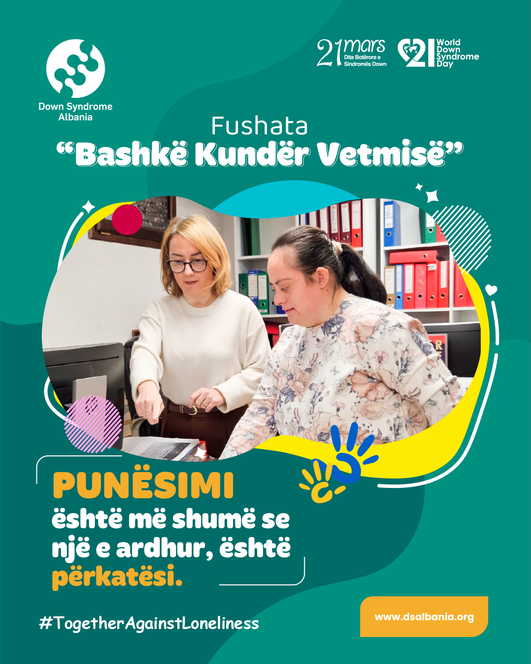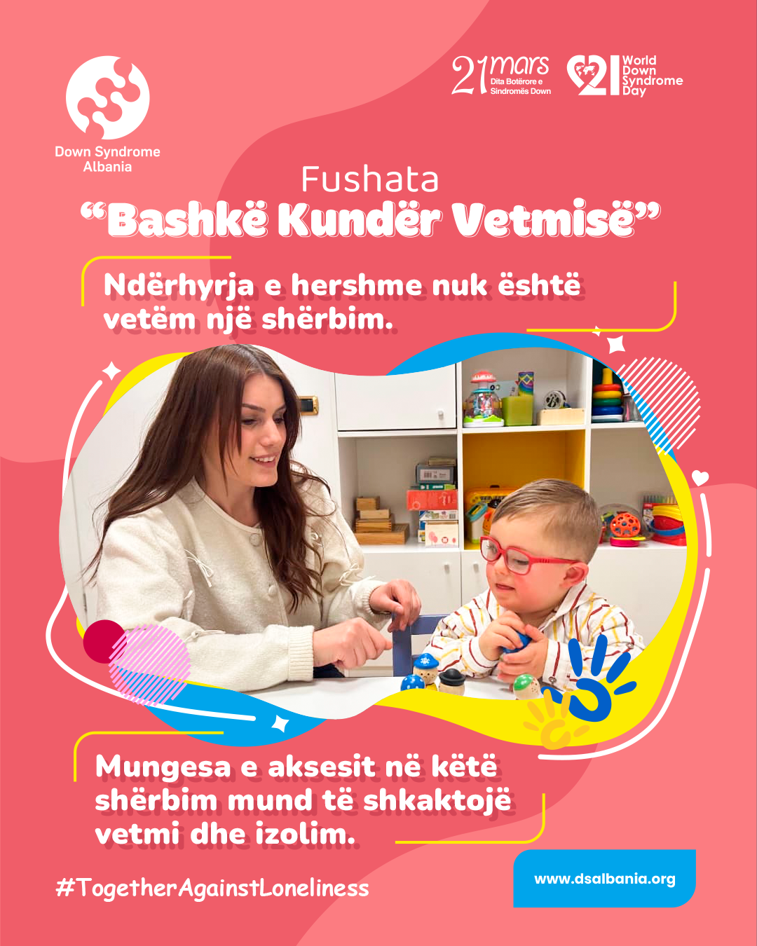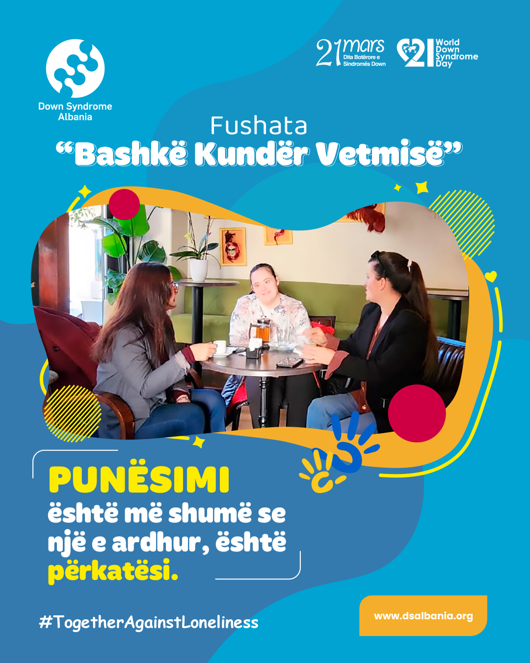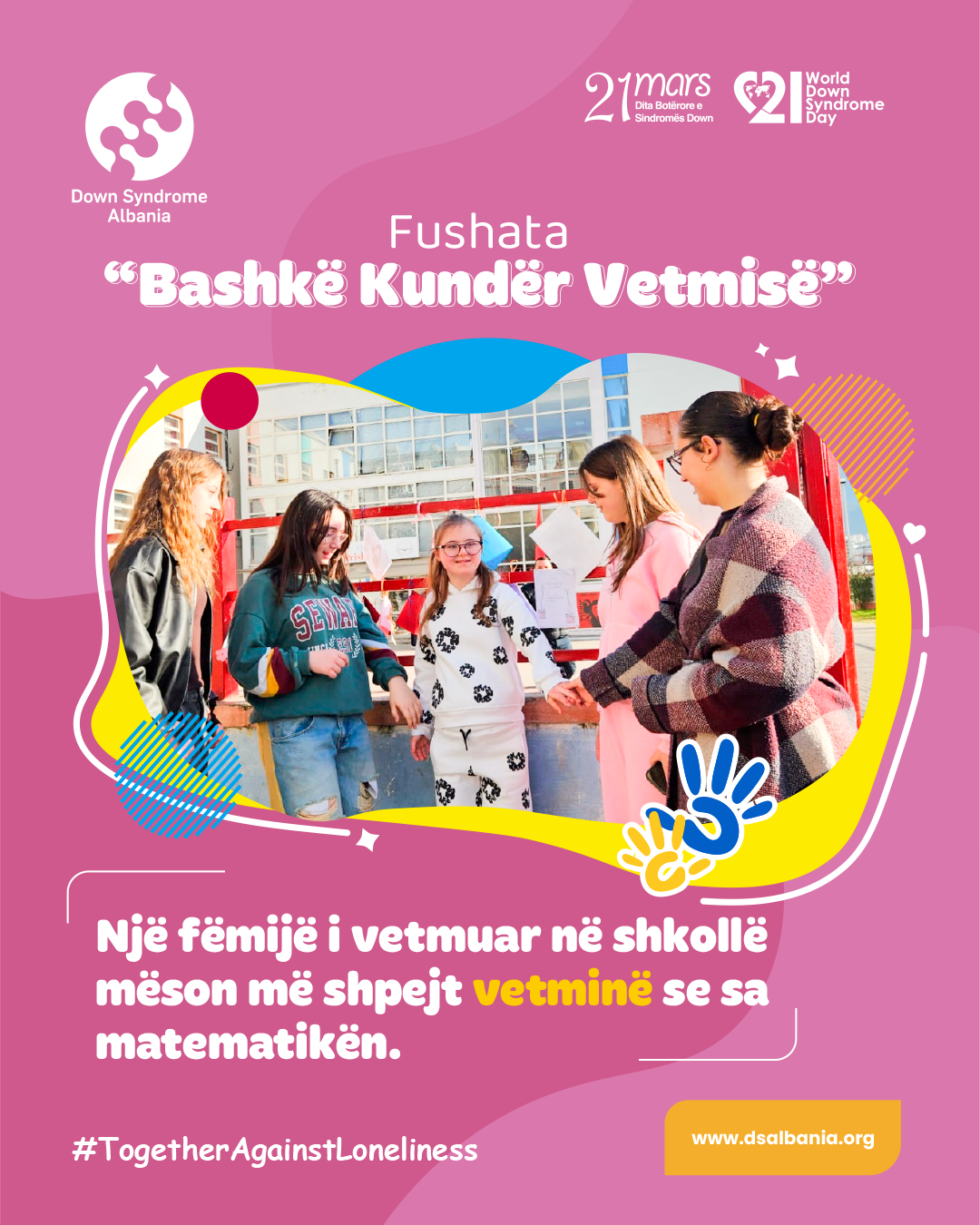 Këtë vit, tema ndërgjegjësuese e diktuar nga Down Syndrome International ku Fondacioni ynë është i antarësuar, është "Bashkë Kundër Vetmisë" #TogetherAgainstLoneliness.